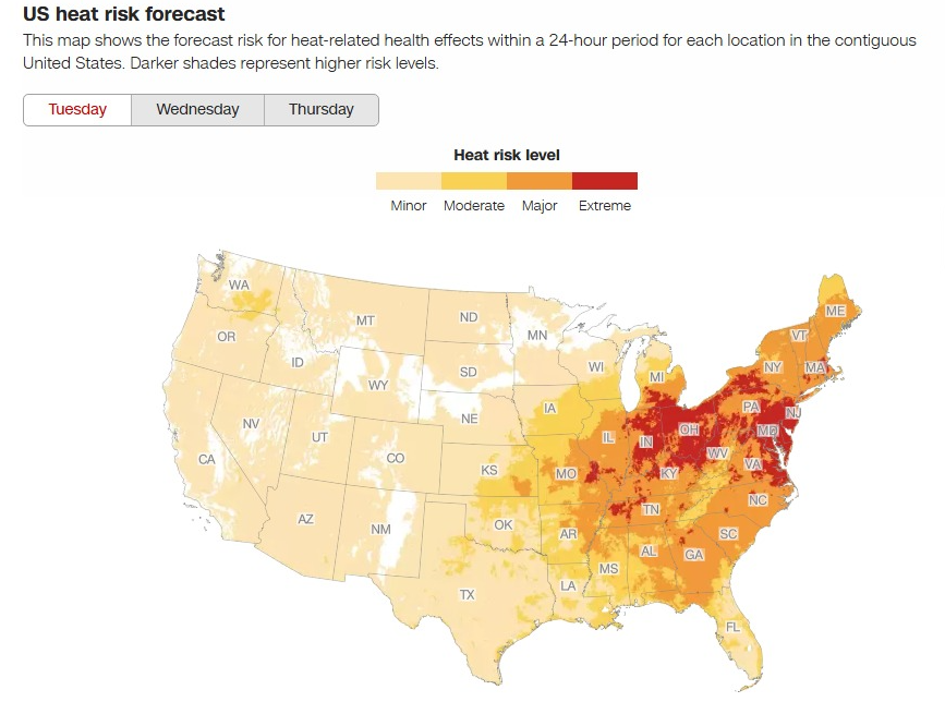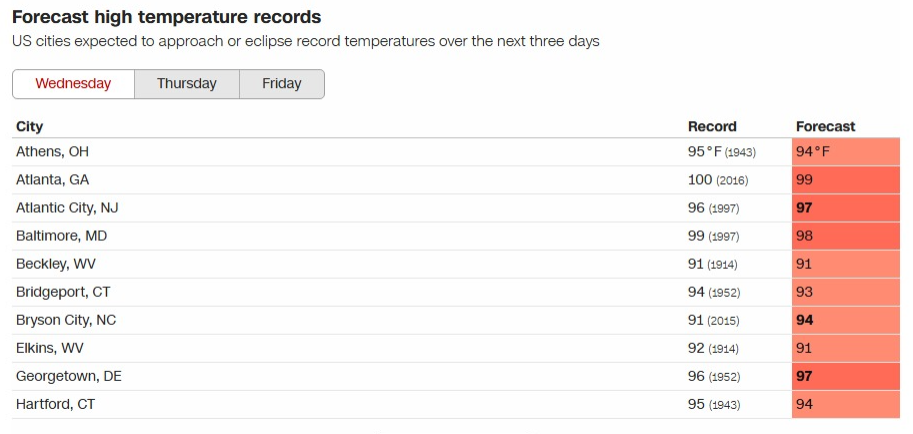 - Wednesday: Temperatures will stay high but be less extreme. Record-breaking heat may persist in parts of the mid-Atlantic.
